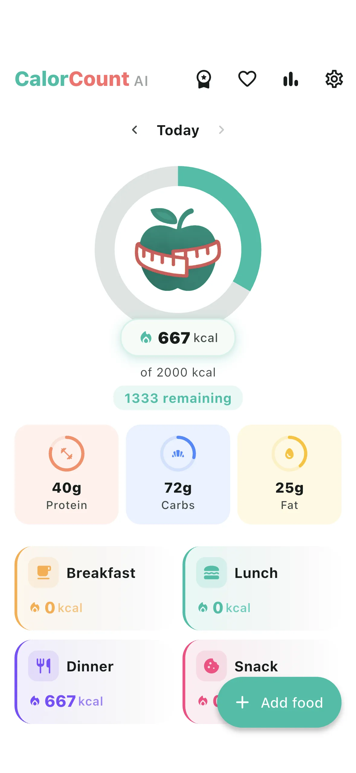 Whether you want to lose weight, maintain, or build muscle — set your personal calorie goal and track daily progress with a visual calorie ring and detailed macro breakdown per meal.